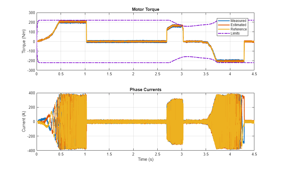 The plot below shows the requested and measured torque for the test, as well as the phase currents in the electric drive.