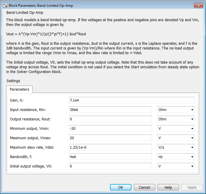 Based on the datasheet values above, set the Band-Limited Op-Amp block parameters as follows: