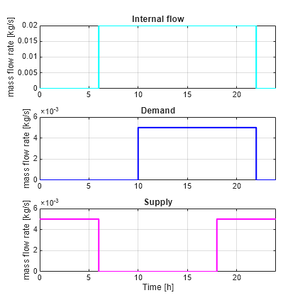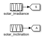 The inputs of the model are the pump flows and the solar variables for irradiance and incidence angle. A repeating sequence block is used to define the inputs because they follow a 24-hour periodic cycle.