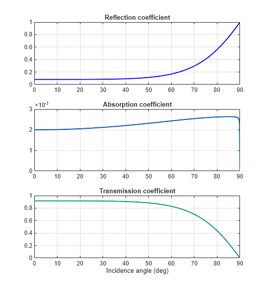 nrel = 1.52; %Optical index from air to glass theta = linspace(0, pi/2, 100); rp = ( nrel^2*cos(theta) - sqrt(nrel^2 - sin(theta).^2) ).^2./... ( nrel^2*cos(theta) + sqrt( nrel^2 - sin(theta).^2 ) ).^2 ; rs = ( cos(theta) - sqrt(nrel^2 - sin(theta).^2) ).^2./... ( cos(theta) + sqrt( nrel^2 - sin(theta).^2 ) ).^2 ; r = 0.5*(rp + rs); t = 1 - r; figure(); plot(theta*180/pi, rp, 'Color', [0 1 1], 'LineWidth', 1.5); hold on plot(theta*180/pi, rs, 'Color', [0 0.5 1], 'LineWidth', 1.5); plot(theta*180/pi, r, 'Color', [0 0 1], 'LineWidth', 1.5); plot(theta*180/pi, t, 'Color', 'm', 'LineWidth', 1.5); legend('rp','rs','r','t'); xlabel('Incidence angle (deg)'); grid on box on