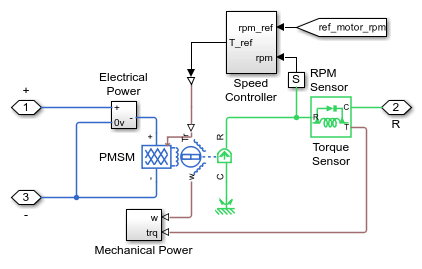 The motor, generator, and DC-DC converter are modeled using Simscape™ Electrical™ library blocks. These blocks use energy-based system-level equations that result in an efficient simulation whilst still capturing conversion losses. As such, the model is suitable for supporting design of the power management strategy. This example can be directly compared with the Simscape Driveline™ sdl_hybrid_power_split example which also includes more accurate representations of the engine, tires and mechanical gears.