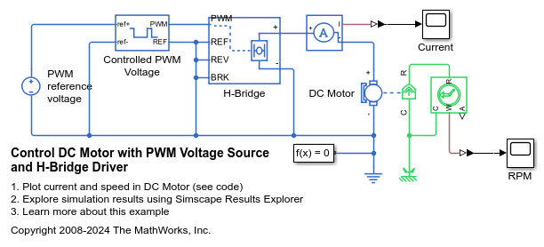 Open the PWMControlledDCMotor model. The Controlled PWM Voltage block generates a pulse-width modulated signal. The H-Bridge block receives this PWM signal and drives the motor by generating a constant output voltage equal to the average value of the PWM signal. When the motor is on, the H-Bridge block connects the motor terminals to the power supply. When the motor is off, the H-Bridge block acts as a freewheeling diode to maintain the motor current.