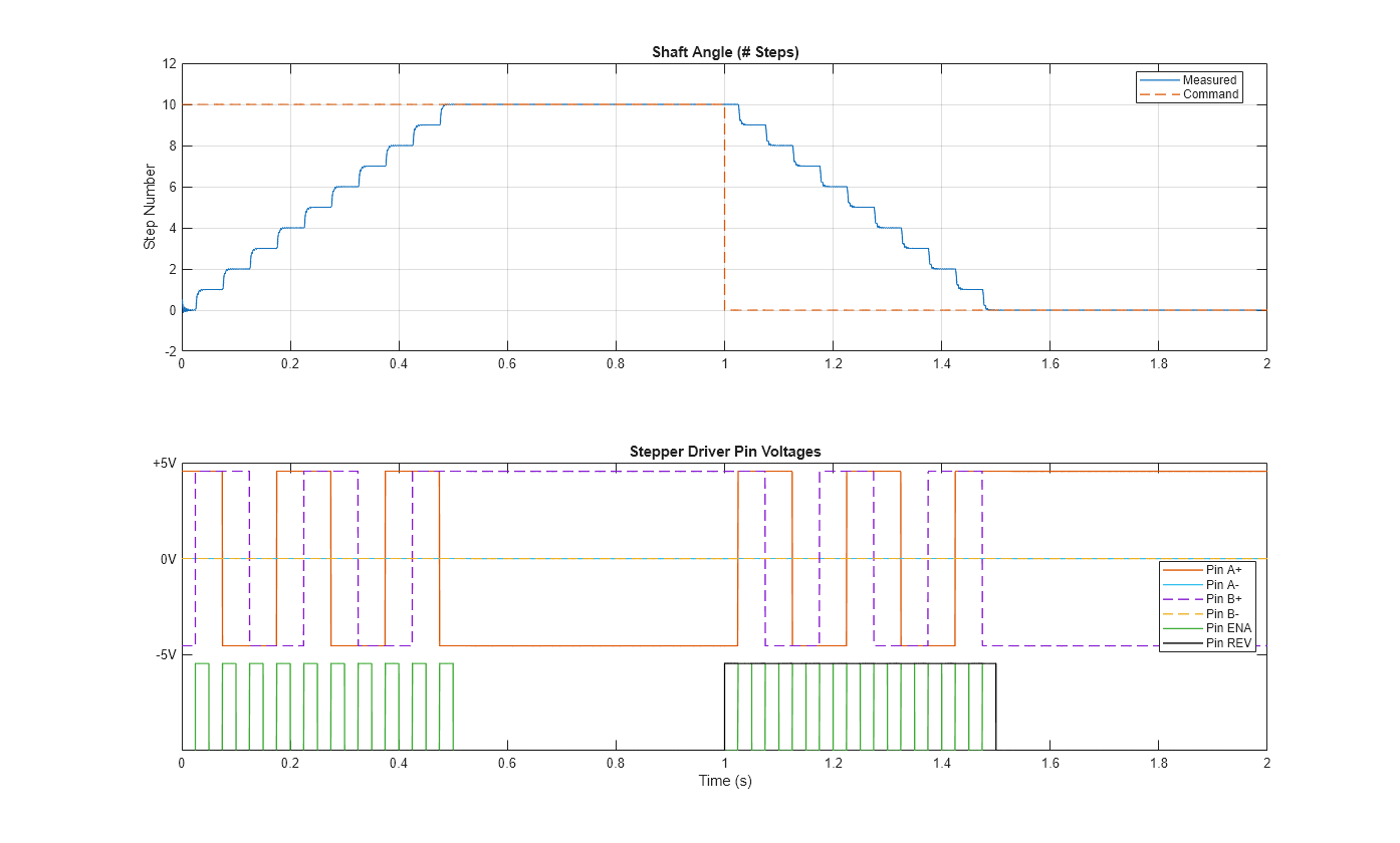 This plot shows how the states of the pins on the stepper driver affect the motion of the stepper motor. The driver initiates a step each time the enable (ENA) signal rises above the value of the Enable threshold voltage parameter of the Stepper Motor Driver block.