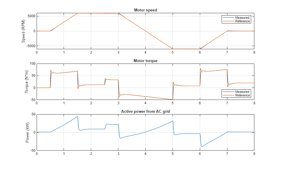 The plot below shows the requested and measured motor speed, the requested and measured motor torque, and the active power that flows from the AC grid.