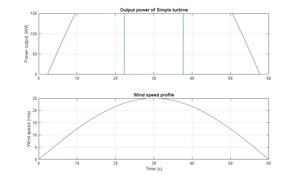 The plot below shows the input wind speed and output power of the Simple turbine block.