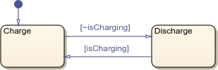 ChargetoDischargeonly when the battery is not charging, double-click the transition and enter the label[~isCharging].To finalize the label, click the canvas. To move the label, click the center of the label text and drag.