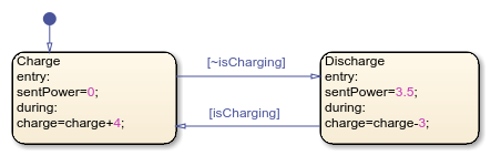 Discharge, add a child state namedPowered. Add aduringaction that decrementschargeby3.Add another child state named