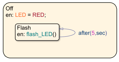 The Off state uses a substate called Flash with a self-loop transition to control a status LED. The transition label after(5,sec) triggers the entry action of the substate and causes the LED to flash every 5 seconds.