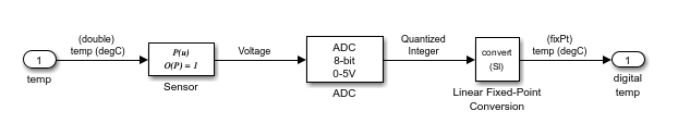 The Linear Fixed-Point Conversion block processes the 8-bit integers into final temperature values. It applies a calibrated slope and a bias offset to generate the digital temperature reading. This maintains compatibility with the 8-bit environment while preserving measurement accuracy.