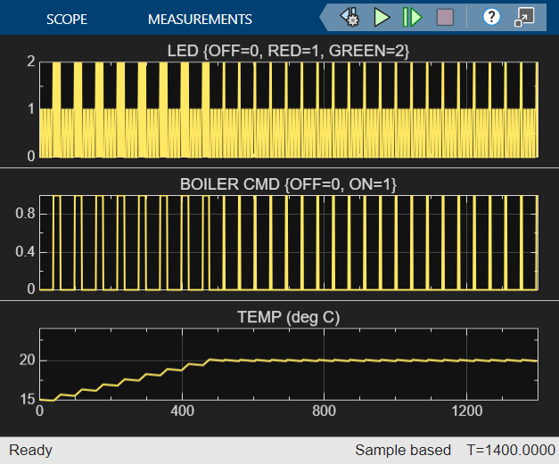 The simulation results show that the boiler reaches 20°C after 450 seconds (7.5 minutes). The bang-bang controller then maintains this target temperature throughout the remaining runtime.