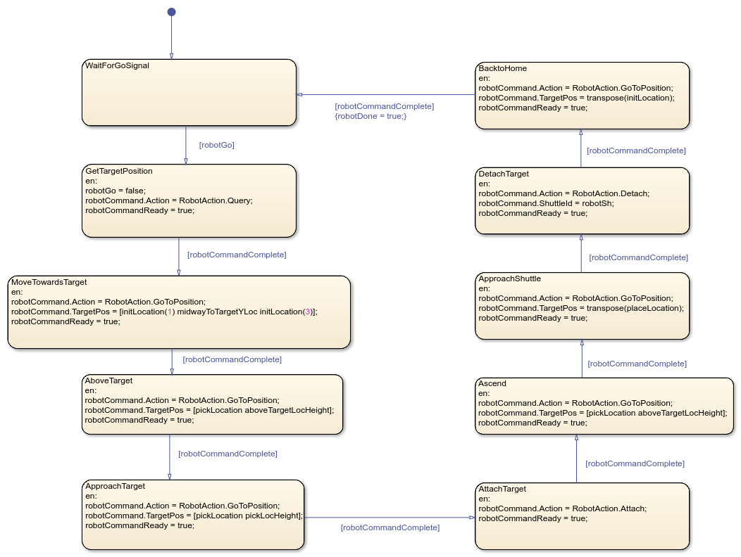 A robot begins the loop by waiting for a shuttle in the WaitForGoSignal state. When a shuttle arrives, robotGo becomes true and the robot transitions to the next state.