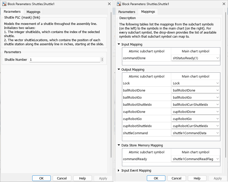 The Block Parameters window shows how symbols in the BallRobot atomic subchart map to data objects in the Controllers chart. For example, the pickLocation input in BallRobot receives data from the ballRobotTargetLoc object in Controllers. For more information about mapping, see Map Variables for Atomic Subcharts and Boxes.