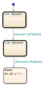 In a similar way, Sensor2 reads the input u2 and checks that its value remains between 100 and -100. Sensor2 passes this value as the output of y. Otherwise, the sensor fails and the chart transitions to the Alarm state.
