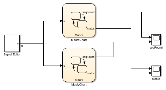 In this model, two Stateflow® charts use a different set of semantics to find the sequence 1, 2, 1, 3 in the input signal from a Signal Editor (Simulink) block.