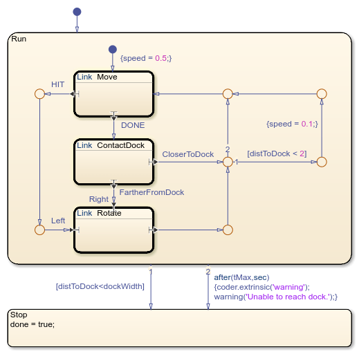 Similarly, the linked atomic subchart ContactDock contains two exit ports, CloserToDock and FartherFromDock. Inside the subchart, each exit port has a matching exit junction. During simulation, the state actions in the substate ContactDock call the distanceToDock function in the Robot chart. This function determines the distance from the robot to the docking station. If this distance decreased in the last time step, the chart transitions out of the subchart by using the exit port CloserToDock. Otherwise, the chart transitions out of the subchart by using the exit port FartherFromDock.
