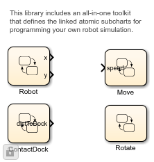 The Robot chart is a library chart that is linked from the Simulink library model sfRobotExampleLib.slx. This library includes an all-in-one toolkit that defines this chart as well as the linked atomic subcharts for programming your own robot simulation. For more information, see Libraries and Blocksets (Simulink).