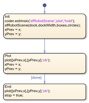 To call sfRobotScene, plot, and hold as extrinsic functions, the chart uses the coder.extrinsic (Simulink) function. For more information, see Call Extrinsic MATLAB Functions in Stateflow Charts.