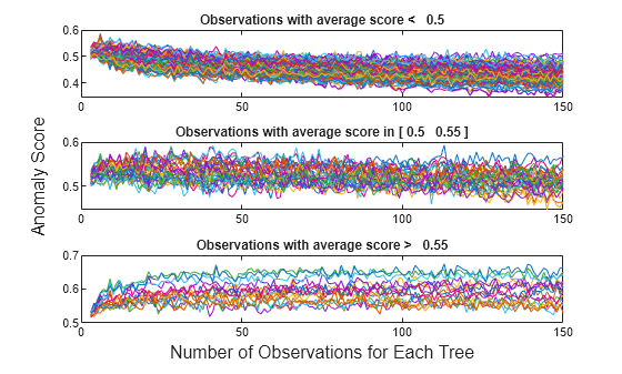 score_threshold1 = 0.5; score_threshold2 = 0.55; m = mean(s,2,"omitnan"); ind1 = find(m < score_threshold1); ind2 = find(m <= score_threshold2 & m >= score_threshold1); ind3 = find(m > score_threshold2); figure t = tiledlayout(3,1); nexttile plot(s(ind1,:)') title(join(["Observations with average score < " score_threshold1])) nexttile plot(s(ind2,:)') title(join(["Observations with average score in [" ... score_threshold1 " " score_threshold2 "]"])) nexttile plot(s(ind3,:)') title(join(["Observations with average score > " score_threshold2])) xlabel(t,"Number of Observations for Each Tree") ylabel(t,"Anomaly Score")