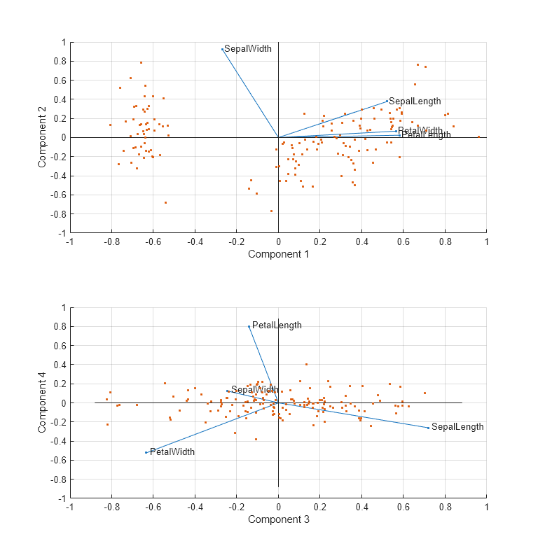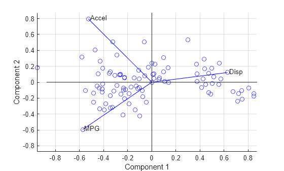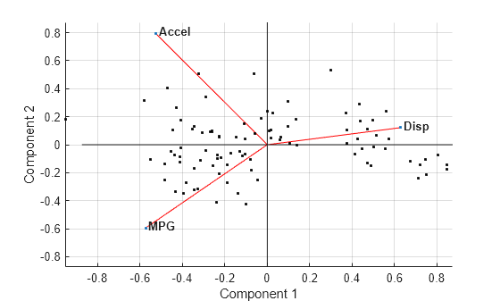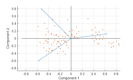 coefsto be positive. This action flips some of the vectors incoefsto the opposite direction, but often makes the plot easier to read. Interpretation of the plot is unaffected, because changing the sign of a coefficient vector does not change its meaning.Scales the scores so that they fit on the plot. That is, the function divides each score by the maximum absolute value of all scores, and multiplies by the maximum coefficient length of