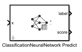function of a neural network classification object (ClassificationNeuralNetwork or CompactClassificationNeuralNetwork). For an example, see Predict Class Labels Using MATLAB Function Block.
