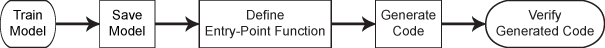 After you train a model, save the trained model by using saveLearnerForCoder. Define an entry-point function that loads the saved model by using loadLearnerForCoder and calls the object function. Then generate code for the entry-point function by using codegen, and verify the generated code.