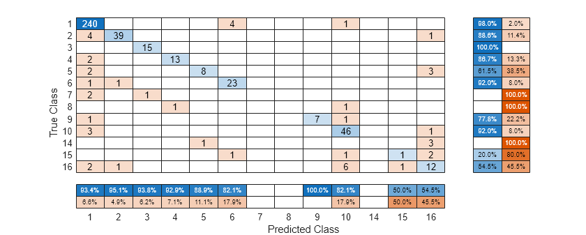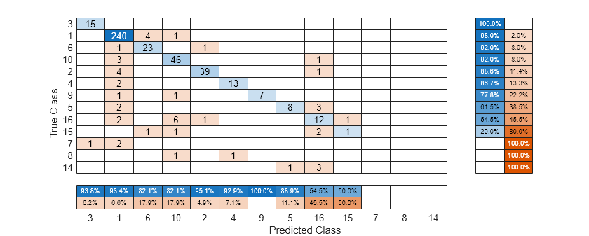 The confusion matrix displays the total number of observations in each cell. The rows of the confusion matrix correspond to the true class, and the columns correspond to the predicted class. Diagonal and off-diagonal cells correspond to correctly and incorrectly classified observations, respectively.