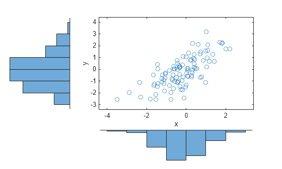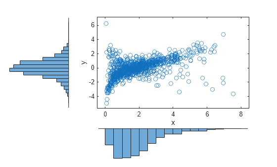 load stockreturns x = stocks(:,1); y = stocks(:,2); scatterhist(x,y,'Direction','out')