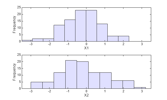 load stockreturns nobs = size(stocks,1); subplot(2,1,1) histogram(stocks(:,1),10,'FaceColor',[.8 .8 1]) xlim([-3.5 3.5]) xlabel('X1') ylabel('Frequency') subplot(2,1,2) histogram(stocks(:,2),10,'FaceColor',[.8 .8 1]) xlim([-3.5 3.5]) xlabel('X2') ylabel('Frequency')
