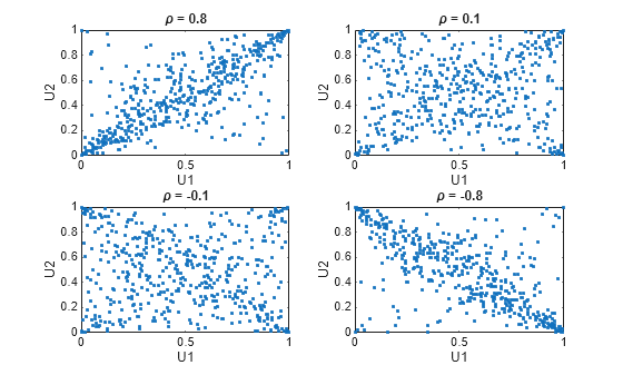 n = 500; rng('default') % for reproducibility U = copularnd('Gaussian',[1 .8; .8 1],n); subplot(2,2,1) plot(U(:,1),U(:,2),'.') title('{\it\rho} = 0.8') xlabel('U1') ylabel('U2') U = copularnd('Gaussian',[1 .1; .1 1],n); subplot(2,2,2) plot(U(:,1),U(:,2),'.') title('{\it\rho} = 0.1') xlabel('U1') ylabel('U2') U = copularnd('Gaussian',[1 -.1; -.1 1],n); subplot(2,2,3) plot(U(:,1),U(:,2),'.') title('{\it\rho} = -0.1') xlabel('U1') ylabel('U2') U = copularnd('Gaussian',[1 -.8; -.8 1],n); subplot(2,2,4) plot(U(:,1),U(:,2),'.') title('{\it\rho} = -0.8') xlabel('U1') ylabel('U2')