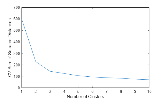 In general, when determining how many clusters to use, consider the greatest number of clusters that corresponds to a significant decrease in the cross-validated sum of squared distances. For this example, using two or three clusters seems appropriate, but using more than three clusters does not.