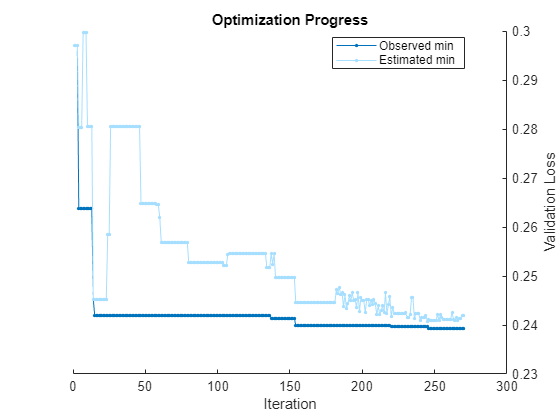 By default, fitcauto provides a plot of the optimization and an iterative display of the optimization results. For more information on how to interpret these results, see Verbose Display.