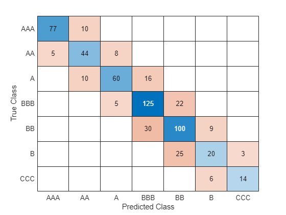 rng("default") % For reproducibility of the partition c = cvpartition(creditrating.Rating,"Holdout",0.15); trainingIndices = training(c); % Indices for the training set testIndices = test(c); % Indices for the test set creditTrain = creditrating(trainingIndices,:); creditTest = creditrating(testIndices,:);