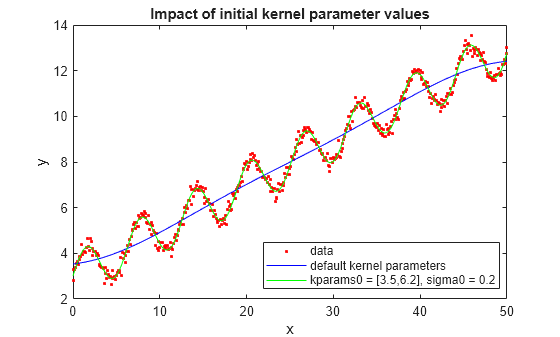 ![Figure contains an axes object. The axes object with title Impact of initial kernel parameter values, xlabel x, ylabel y contains 3 objects of type line. One or more of the lines displays its values using only markers These objects represent data, default kernel parameters, kparams0 = [3.5,6.2], sigma0 = 0.2.](../examples/stats/win64/ImpactofSpecifyingInitialKernelParameterValuesExample_01.png)