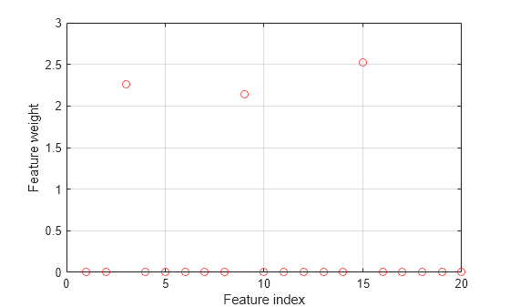 figure() plot(mdl.FeatureWeights,'ro') grid on xlabel('Feature index') ylabel('Feature weight')
