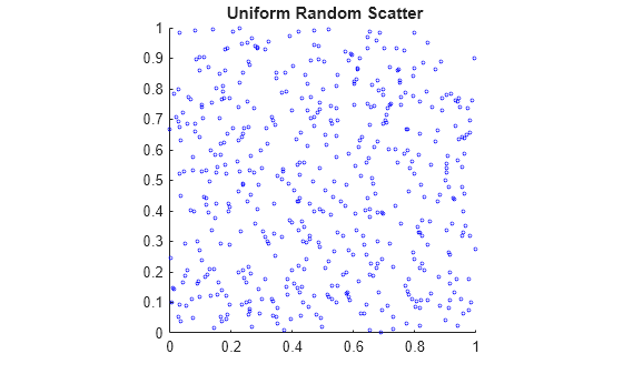 X = rand(500,2); scatter(X(:,1),X(:,2),5,'b') axis square title('{\bf Uniform Random Scatter}')