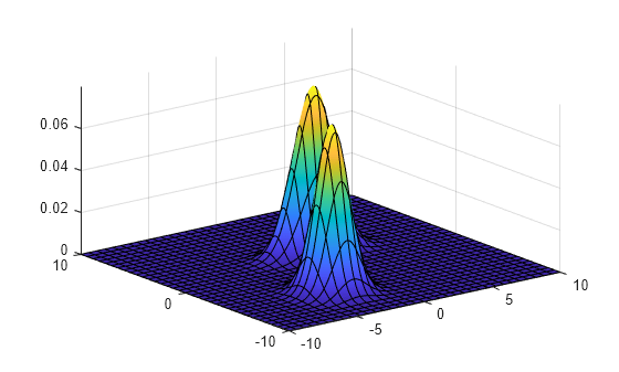 gmPDF = @(x,y) arrayfun(@(x0,y0) pdf(gm,[x0 y0]),x,y); fsurf(gmPDF,[-10 10])