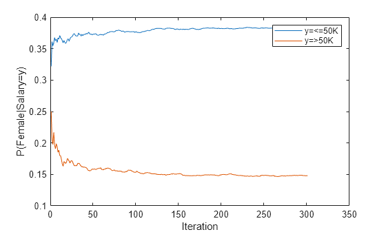 figure plot(catdistms) ylabel('P(Female|Salary=y)') legend(sprintf("y=%s",IncrementalMdl.ClassNames(1)),sprintf("y=%s",IncrementalMdl.ClassNames(2))) xlabel('Iteration')