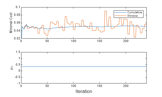t = tiledlayout(2,1); nexttile h = plot(mc.Variables); xlim([0 nchunk]) ylabel('Minimal Cost') legend(h,mc.Properties.VariableNames) nexttile plot(mu11) ylabel('\mu_{11}') xlim([0 nchunk]) xlabel(t,'Iteration')