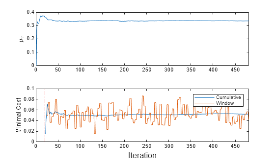 t = tiledlayout(2,1); nexttile plot(mu11) ylabel('\mu_{11}') xlim([0 nchunk]) nexttile h = plot(mc.Variables); xlim([0 nchunk]) ylabel('Minimal Cost') xline(Mdl.MetricsWarmupPeriod/numObsPerChunk,'r-.') legend(h,mc.Properties.VariableNames) xlabel(t,'Iteration')