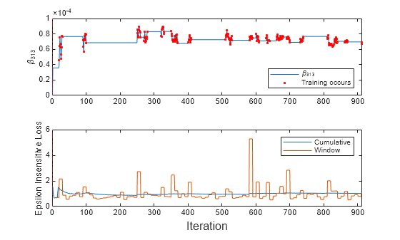 t = tiledlayout(2,1); nexttile plot(beta313) hold on plot(find(trained),beta313(trained),'r.') xlim([0 nchunk]) ylabel('\beta_{313}') xline(Mdl.EstimationPeriod/numObsPerChunk,'r-.') legend('\beta_{313}','Training occurs','Location','southeast') hold off nexttile plot(ei.Variables) xlim([0 nchunk]) ylabel('Epsilon Insensitive Loss') xline(Mdl.EstimationPeriod/numObsPerChunk,'r-.') legend(ei.Properties.VariableNames) xlabel(t,'Iteration')