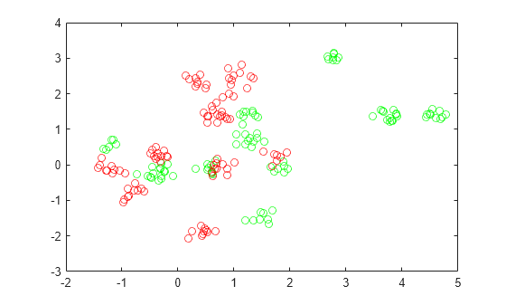 Put the data into one matrix, and make a vector grp that labels the class of each point. 1 indicates the green class, and –1 indicates the red class.