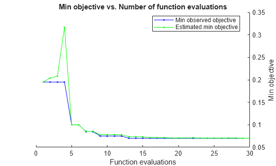 Figure contains an axes object. The axes object with title Min objective vs. Number of function evaluations, xlabel Function evaluations, ylabel Min objective contains 2 objects of type line. These objects represent Min observed objective, Estimated min objective.