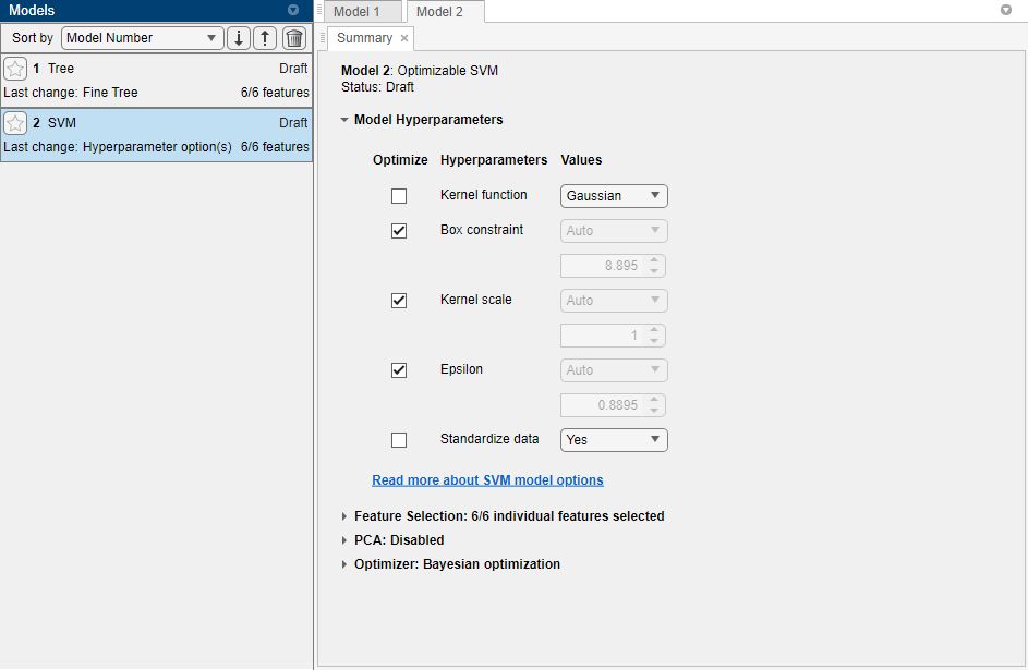 8. Select the model hyperparameters to optimize. In the Summary tab, you can select Optimize check boxes for the hyperparameters that you want to optimize. By default, all the check boxes for the available hyperparameters are selected. For this example, clear the Optimize check boxes for Kernel function and Standardize data. By default, the app disables the Optimize check box for Kernel scale whenever the kernel function has a fixed value other than Gaussian. Select a Gaussian kernel function, and select the Optimize check box for Kernel scale.