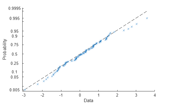 "probability"Display a probability plot using a cdf of the data and a cdf of the fitted probability distribution. This option is available only when pd is parametric and fit to data.