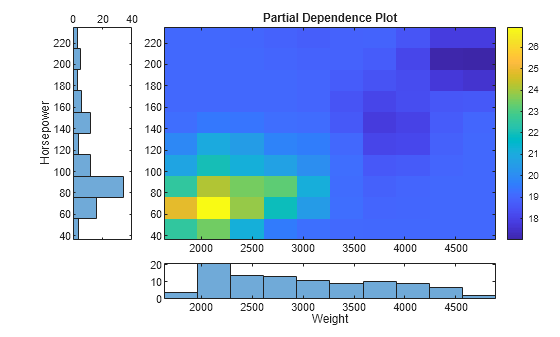 t = tiledlayout(5,5,"TileSpacing","compact"); ax1 = nexttile(2,[4,4]); imagesc(x,y,pd) title("Partial Dependence Plot") colorbar("eastoutside") ax1.YDir = "normal"; ax2 = nexttile(22,[1,4]); dX = diff(ptX(1:2)); edgeX = [ptX-dX/2;ptX(end)+dX]; histogram(Weight,edgeX); xlabel("Weight") xlim(ax1.XLim); ax3 = nexttile(1,[4,1]); dY = diff(ptY(1:2)); edgeY = [ptY-dY/2;ptY(end)+dY]; histogram(Horsepower,edgeY) xlabel("Horsepower") xlim(ax1.YLim); ax3.XDir = "reverse"; camroll(-90)