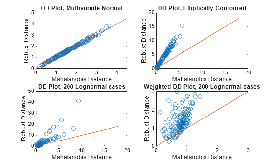 figure subplot(2,2,1) plot(d_classical1,d1, 'o') line([0 4.5], [0, 4.5]) xlabel('Mahalanobis Distance') ylabel('Robust Distance') title('DD Plot, Multivariate Normal') subplot(2,2,2) plot(d_classical2, d2, 'o') line([0 18], [0, 18]) xlabel('Mahalanobis Distance') ylabel('Robust Distance') title('DD Plot, Elliptically-Contoured') subplot(2,2,3) plot(d_classical3, d3, 'o') line([0 18], [0, 18]) xlabel('Mahalanobis Distance') ylabel('Robust Distance') title('DD Plot, 200 Lognormal cases')