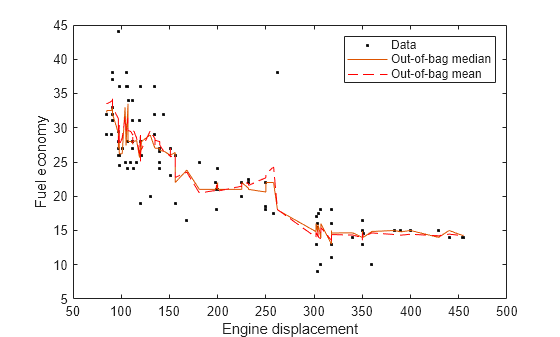 Figure contains an axes object. The axes object with xlabel Engine displacement, ylabel Fuel economy contains 3 objects of type line. One or more of the lines displays its values using only markers These objects represent Data, Out-of-bag median, Out-of-bag mean.