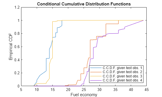 X,quantilePredict:Estimates the conditional distribution of the response by computing response weights for each tree.