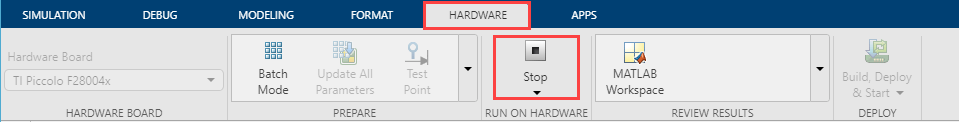 Note: At any point during the course of the simulation, you can open the External Mode Control Panel, as shown. The Hardware > control panel provides more options, such as the ability to connect or disconnect to the target without terminating the execution of the generated code.