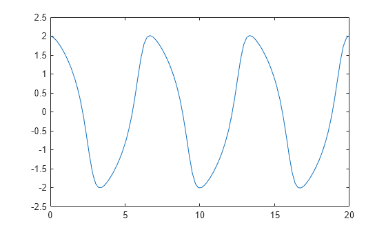 Specify the solution interval to be [0 20] and the initial conditions to be y(0)=2 and y(0)=0. Solve the system of first-order differential equations by using ode45.